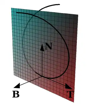منحنى فضائي ؛ الأشعة T، N وB ؛ والسطح المهتز يمتدّ من قبل T وN.