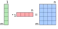 الضرب الخارجي للمتجهين u ⊗ v يوازي ضرب مصفوفتين عدد الصفوف في الأولى يساوي عدد الأعمدة في الأخرى (بعد أخذ المصفوفة المنقولة لها) ورتبة كل منهما هي 1: لتكن الأولى u بالبعد m × 1 وبعدد صفوف m، ولتكن v الثانية بالبعد n × 1 وبعدد أعمد n، عندئذ يتم صياغة علاقة الضرب الخارجي كالآتي:[2]