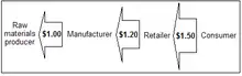 - ثم يبيع بائع التجزئة القطعة إلى المستهلك مقابل 1.5 دولار تاركا هامش الربح الإجمالي من 0.30 دولار.
