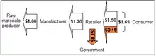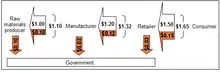 - يفرض بائع التجزئة رسوماً على المستهلك (1.50 دولار × 1.10) = 1.65 دولارًا ويدفع للحكومة 0.15 دولار تاركًا هامش الربح الإجمالي 0.30 دولار.