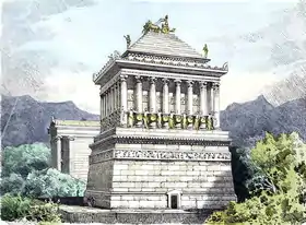 يذهب بعض الباحثين إلى الاعتقاد بأن زوجة الملك موسولوس التي كانت تدعى "آرتميس الثانية" (Artemisia II) هي التي شيدت لزوجها الضريح بعد وفاته. كان الضريح الذي لم يتبق منه شيء اليوم، عبارة عن بناء مستطيل الشكل، ارتفاعه الكلي يبلغ حوالي 45 مترا، يتكون من ثلاثة أجزاء. المستوى السفلي منه عبارة عن قاعة ضخمة من الرخام الأبيض، يليه المستوى الثاني الذي يوجد به 36 عمودًا، موزعة على جميع أجزاء البناء، تحمل تلك الأعمدة سقفا على شكل هرم مدرج، تعلوه عربة فاخرة ذات أربعة جياد.
