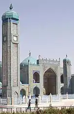 - أسفل يمين: المسجد الأزرق في مدينة مزار شريف الأفغانية، وبها مقام للإمام علي، سميت المدينة مثل بسبب وجودها.