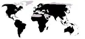 ![]() أماكن انتشار الضفدع عالميا (باللون الأسود) | |
