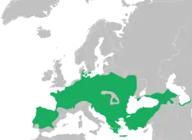 ينتشر هذا النوع على نطاق واسع ويمتد من شبه الجزيرة الايبيرية وفرنسا شرقا إلى غرب روسيا ومنطقة القوقاز، وجنوبا إلى منطقة البلقان وتركيا. وهو يندر وجودها في الدول الإسكندنافية (باستثناء جنوب وشرق الدنمارك وجنوب غرب السويد) ووجدت سابقا في بريطانيا لكنه يعتبر الآن منقرضة هناك.[4]