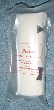 الضمادة المرنة (المعروفة أيضًا باسم ضمادة أيه سي إي أو الرباط المرن أو ضمادة الضغط أو ضمادة قماش الكريب) هي "ضمادة قابلة للمط تستخدم للضغط بشكل مركز على موضع معين".[1][2] تستخدم الضمادات المرنة بشكل شائع في معالجة التواء العضلات وإجهادها عن طريق إبطاء تدفق الدم في منطقةٍ معينة من خلال الضغط بشكل ثابتٍ يمكنه حصر التورم في مكان الإصابة. تُستخدم الضمادات المرنة أيضًا في معالجة كسر العظم؛ حيث يوضع الحشو أولاً على الطرَف المكسور، ثم توضع الجبيرة (غالبًا ما تكون من الجبس). بعد ذلك، توضع الضمادة المرنة لتثبيت الجبيرة وحمايتها. وتعد هذه طريقة شائعة في الكسور العُرضة للتورم الذي قد يؤثر بشكل سلبي على وظيفة قالب الجبيرة. وعادةً ما تتم إزالة هذا النوع من الجبائر بعد شفاء التورم وعندها يُمكن استخدام قالب جبيرة من الألياف الزجاجية أو الجبس. ب نظرًا لخطورة الإصابة بحساسية اللاتكس بين المستخدمين، فقد تم تغيير التركيب الأصلي للضمادات المرنة. وعلى الرغم من أن بعض هذه الضمادات لا تزال تُصنع من اللاتكس، فهناك الكثير من الضمادات المرنة المصنوعة بطريقة النسج والحياكة التي توفر ضغطًا مناسبًا دون استخدام مطاط طبيعي أو لاتكس. تتكون الضمادة المرنة الحديثة من خيوطٍ مرنةٍ من القطن والبولي إستر خالية من اللاتكس. وعن طريق تغيير نسبة القطن والبولي إستر والخيوط المرنة، يستطيع مصنّعو الضمادات توفير مستويات مختلفة من الضغط والصمود في تلك الضمادات. وغالبًا ما تستخدم مشابك من الألومنيوم أو المشابك القابلة للمط في تثبيت الضمادة في مكانها بمجرد ربطها حول الإصابة. حتى إنه يوجد لبعض الضمادات أغلفة من الفيلكرو لضمان ثبات الضمادة في مكانها.