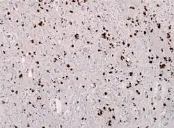 ![]() الكيمياء النسيجية المناعية بالألفا-ساينوسلين تظهر العديد من المشتملات الدبقية. الكيمياء النسيجية المناعية بالألفا-ساينوسلين تظهر العديد من المشتملات الدبقية. | |