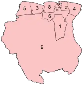 تم أول تقسيم في 8 أكتوبر 1834 من قبل هولندا عندما أعلن المرسوم الملكي أيام الأستعمار الهولندي بتقسم الدولة إل 8 أقسام و ضاحيتين : سورينام و توراريكا العليا، و بارا، و كوميويجني العليا، و كوتيكا، و بيريكا العليا، و كوميويجني السفلى، و كوتيكا السفلى، و ماتابيكا، و ساراماكا، و ضاحية كوروني، و ضاحية نيكيري. الأقسام كانت مناطق بالقرب من مدينة العاصمة باراماريبو والضواحي كانت بعيد عن المدينة.