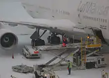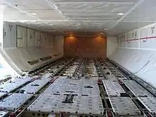 بوينغ 747 أمام حجرة أقل. ملاحظة بكرات ل ULDs على الأرض، وقسم المسمى "تحذير: لا تصل - مياه الشرب داخل تانك". يجب أن يكون على متن طائرات الفضاء لتخزين الأمتعة التي سوف لا يصلح بأمان في المقصورة الركاب.