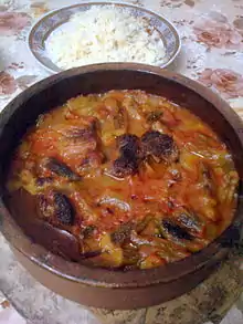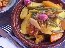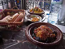 الطاجين هو آنية وطبق يجمع المغرب العربي [4][5] يحضرعلى نار خفيفة ولساعات عدة، مما يؤدي إلى انفصال اللحم عن العظم وتمازج نكهة الخضروات باللحم والمرق. للغطاء مقبض يُمكن بيد واحدة رفعه بسهولة لإضافة المكونات أو التوابل أو المرق إذا لزم الأمر.