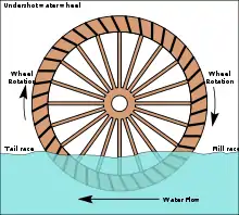 جريان عكسي على دولاب مائي،مثال لطاحونة مائية تستخدم غالباً لزيادة الطاقة المنتجة من أسلوب الجريان الأرضي[4]