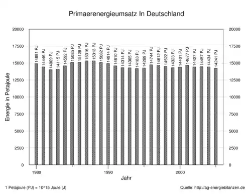 يبين الشكل البياني استهلاك الطاقة الأولية في ألمانيا في الأعوام بين 1980 - 2005. وقد استخدمت وحدة بيتا جول على المحور الرأسي، حيث 1 بيتا = 1015.