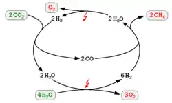 هي الجمع بين الهيدروجين وثاني أكسيد الكربون وتحويل الغازين إلى غاز الميثان باستخدام تفاعل الميثان أو الميثان البيولوجي مما يؤدي إلى خسارة تحويل طاقة إضافية بنسبة 8٪.[4] يمكن بعد ذلك تغذية الميثان في شبكة الغاز الطبيعي أو تحويلها إلى غاز البترول المسال مع الهدرجة العكسية الجزئية عند الضغط العالي ودرجة الحرارة المنخفضة.[5]