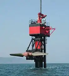 2. طريقة الأبراج : تعتمد تلك الطريقة على تثبيت مروحة أو مروحتان على برج متين بحيث تكون تلك المراوح تحت سطح الماء. وبنفس الطريقة المشروحة أعلاه تتحول طاقة حركة المروحة بواسطة المولد الكهربائي إلى كهرباء. والصورة المجاورة (أنظر الصورة) توضح كيفية تثبيت المروحة على البرج وهي لمحطة تجريبة بـُنيت عام 2002 بشمال إيرلندا وقوتها 300 كيلوات تقريباً، ونلاحظ في الصورة أن المروحة قد رُفعت فوق سطح الماء لإجراء أعمال الصيانة.