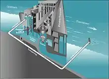 محطات نقل الطاقة عن طريق ضخها، وتديرها العنفات في المصب في أوقات الاستهلاك المرتفع، وضخ المياه في المنبع خلال ساعات *محطة توليد طاقة المد والجزر، توجيه تيارات المد والجزر اعتمادا على طبيعة السد (السدود، الوزن، الدعامات، الأرض، المحمول...): سقوط مرتفع أو متوسط أو منخفض، وتستخدم ثلاثة أنواع رئيسية من التوربينات (المراوح أو العنفات) على التوالي: بيلتون (Pelton)، فرانسيس (Francis)أو كابلان (Kaplan)[4]