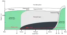 بعد غروب الشمس تتدرج الرياح بالقرب من زيادات السطح، مع زيادة الاستقرار.[19] الاستقرار في الغلاف الجوي الذي يحدث في الليل مع التبريد الإشعاعي الذي يميل لاحتواء الدوامات المضطربة عموديا، وزيادة تدرج الرياح.[8] يتأثر حجم انحدار الرياح إلى حد كبير لارتفاع الحمل الحراري لطبقة الحدود، وهذا التأثير هو حتى أكبر من مستوى سطح البحر، حيث لا يوجد اختلاف نهاري من ارتفاع الطبقة الحدودية كما يوجد على الأرض.[20] في الطبقة بين حدود الحمل الحراري، الاندماج القوي يقلل من تدرج الرياح الرأسي.[21]