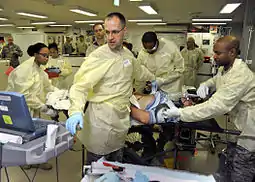 ![]() أطباء طوارئ وتقنيون وآخرون يقومون بعملية تقييم طبي لضحية مفترضة تحاكي الواقع خلال تمرين تدريبي | |
