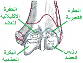يوجد أعلى الجزء الأمامي لرؤيس العضد انخفاض بسيط اسمه الحفرة الكعبرية ، يستقبل الحافة الأمامية لرأس الكعبرة عند ثني الساعد.