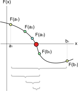 إذا كانت الدالة f(x)= 0 مستمرة ومعرفة في الفترة [a,b] حيث f(a)* f(b) <0 أي أنهما مختلفتان في الإشارة فإن معني ذلك ان أحد جذور الدالة f(x) علي الأقل يقع في نطاق الفترة [a,b] (انظر الشكل 1-1). في هذه الحالة نتبع الخوارزمية التالية للوصول إلي حل هذه الدالة: