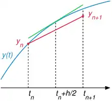 Illustration of the midpoint method assuming that equals the exact value The midpoint method computes so that the red chord is approximately parallel to the tangent line at the midpoint (the green line).