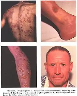 ![]() أمثلة على الطفح الدوائي: (1) جلاد فقاعي بسبب سلفاثيازول (2) طفح دوائي ثابت بسبب فينول فثالين (3) حمامى متعددة الأشكال فقاعية (4)التهاب الجلد الضوئي المنتشر. أمثلة على الطفح الدوائي: (1) جلاد فقاعي بسبب سلفاثيازول (2) طفح دوائي ثابت بسبب فينول فثالين (3) حمامى متعددة الأشكال فقاعية (4)التهاب الجلد الضوئي المنتشر. | |
