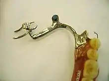 2.المثبت الغير المباشر: (ومثال على ذلك القطعة المعدنيه تبرز من الشريط اللساني في ما يقرب من زاوية 90 درجه بالقرب من أعلى الصورة العلوية، والتي هي مسند على الناب).