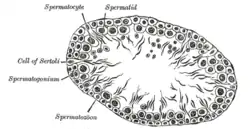 ![]() الظهارة المنتشة في الخصية. 1: الصفيحة القاعدية 2: بزرات النطاف 3: خلية نطفية، المرتبة الأولى 4: خلية نطفية، المرتبة الثانية 5: نطفة أرومية 6: نطفة أرومية ناضجة 7: خلية سيرتولي 8: الموصل المحكم (الحائل الدموي الخصوي) | |
