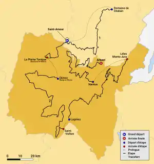 | مرحلة 1 | 13 أغسطس | Lac de Chalain [الإنجليزية] – La Plaine Tonique | مرحلة مستوية | 143٫3 | ||