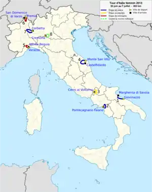 | مرحلة 1 | 30 يونيو | جوفيناتسو – مارغيريتا دي سافويا | مرحلة مستوية | 117٫8 | ||