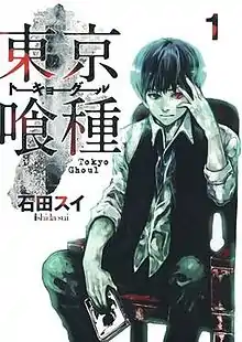 ![]() غلاف المجلد الأول من سلسلة المانغا تظهر فيه شخصية كِن كانيكي | |