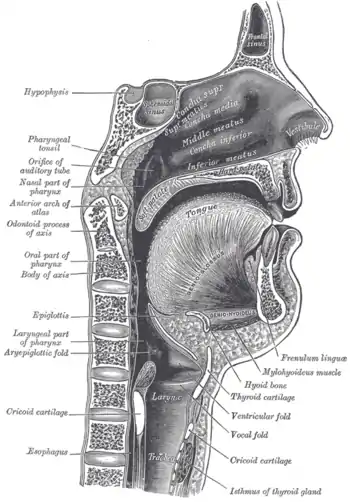 ![]() قطع عبر حنجرة الحصان: 1 العظم اللامي 2 لسان المزمار 3 الطية الدهليزية، أو الطية الصوتية الزائفة، أو الحبل الصوتي الزائف، أو الثنية الدهليزية 4 الأحبال الصوتية، أو الطية الصوتية الحقيقية 5 العضلة البطينية (ألياف العضلة الدرقية الطرجهالية) 6 بطين الحنجرة 7 العضلة الصوتية 8 تفاحة آدم (الغضروف الدرقي) 9 الغضروف الحلقي) 10 تجويف تحت المزمار 11 الغضروف الأول للقصبة الهوائية 12 القصبة الهوائية قطع عبر حنجرة الحصان: 1 العظم اللامي | |