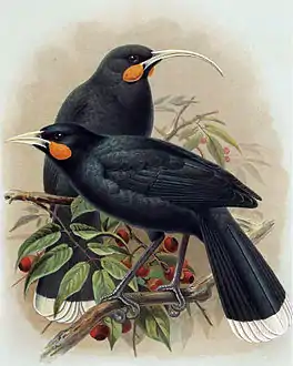 ![]() Illustration of two birds on a tree branch A pair of huia (male in front of female) Painting by J.G. Keulemans from والتر بولر's A History of the Birds of New Zealand (1888) | |