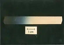 زجاج مسامي مملؤ بالماء، عينة سمكها 1 مم، صُنعت بواسطة عملية الفصل الطوري في التدرج الحراري (درجة الحرارة العالية على اليمين) لزجاج البوروسيلكيت الصوديوم، متبوعة بحمض الغسيل. تأثير تندال هي سبب ظهور تلك الألوان.