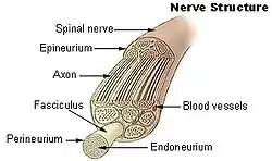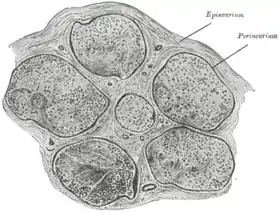 ![]() مقطع مستعرض من عصب قصبة الساق في الإنسان (ظهارة الحزمة العصبية مشار لها في الأعلى) | |