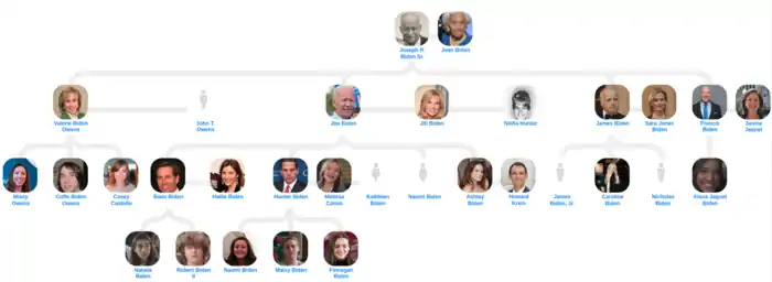 عائلة الرئيس الأمريكي رقم 46 جو بايدن، جو بايدن هو الرئيس رقم 46 والرئيس الحالي للولايات المتحدة، عائلة جو هي عائلة أمريكية، بارزة في القانون والتعليم والنشاط والسياسة. أصبحت عائلة بايدن المباشرة العائلة الأولى للولايات المتحدة عند تنصيبه في 20 يناير 2021. عائلة بايدن من أصول إنجليزية وفرنسية وأيرلندية . هاجر جده الأكبر لبايدن من إنجلترا إلى ماريلاند عام 1822.[1]