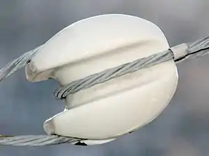 في الجهود المنخفضة , تعزل شدات الأسلاك عن الأرض على ارتفاع أكبر من 13 مترا عن الأرض , ويسمي العازل المستخدم في سلك الشد عازل الدعم من البورسلين ويصمم بحيث أنه في حالة انهيار العازل لا يسقط سلك التثبيت على الأرض .