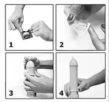 يُغلَّف العوازل الذكريّة عادةً داخل مغلف بلاستيكيّ، بشكل ملفوف، وهومُصمَّم ليُرتدى على قمة القضيب الذكريّ ومن ثمَّ ليُسحب باتجاه الخلف على القضيب المنتصب. من المهم للغاية أن تترك مسافة عند قمة العازل وذلك لترك مجال لجمع السائل المنويّ وذلك لتجنُّب خروجه من قاعدة العازل. بعد الاستخدام، من المستحسن أن يُلف بمنديل أوأن يُعقد (أن يتم لفّه بشكل عقدة) ومن ثم رميه في القمامة.[42] تُستخدم العوازل الذكري لتقليل احتمالية حدوث إلقاح ومن ثُمَّ حمل من خلال الممارسة الجنسيّة، ولتقليل احتمالية انتقال عدوى منتقلة بالجنس خلال الجماع أوالجنس الفمويّ أومن أجل الوقاية حتى.