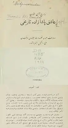 ![]() غلاف كتاب عاشقي الأشهر "تواريخ آل عثمان" بالتركية العثمانية | |