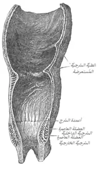 ![]() مقطع إكليلي خلال القناة الشرجية. B. تجويف المثانة البولية V.D. الوعاء الأسهري. S.V. حويصلة منوية. R. الجزء الثاني من المستقيم. A.C. القناة الشرجية. L.A. العضلة الرافعة للشرج. I.S. عاصرة شرجة داخلية. E.S. عاصرة شرجية خارجية. | |
