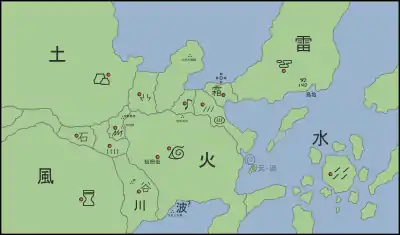 في عالم ناروتو، الدول هي كيانات سياسية متفرقة تحكمها المماليك، في هذه الدول توجد القرى المخفية ( 隠れ里. كاكوريزاتو). مستوطنات تؤوي النينجا، محاربون قادرون على استخدام قدرات خارقة للطبيعة في المعارك، القرية المخفية تحافظ على اقتصاد بلادها بتدريب النينجا من عمر صغير وإرسالهم لمهام دول أخرى، ونينجا القرية المخفية يخدم بلاده كقوة عسكرية، منزلة قائد القرية المخفية تساوي منزلة قائد الدولة، هذه الدول هي الأقوى في عالم ناروتو، يحكم هذه الدول زعماء إقطاعيون، وقادة القرى المخفية يحملون لقب كاغي ( 影 كاغي ، تعني حرفيًا "الظل")، وظهرت أمم أصغر في الأنمي والمانغا لكنها لم تستكشف بعد.