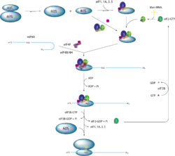 - IF2: وهو جتباز (GTPase) يُثبت جزي GTP (غوانوزين ثلاثي الفوسفات) لحلمأته بحيث يستفيد من الطاقة المحررة كل من العامل IF1، الوحدة الفرعية الصغيرة والرنا الناقل البادئ. ويتعرف على الرنا الناقل البادئ الحامل للحمض الأميني N-فورميل ميثونين [الإنجليزية] (وهو الرنا الحامل للميثونين المفرمل، أول حمض أميني في السلسلة البروتينية) ويقوده إلى الموقع P من الوحدة الفرعية 30S.