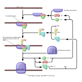 بعد ارتباط الرنا الناقل البادئ (tRNAfMet) بالوحدة الفرعية 30S، ينفصل العامل IF3 عن المركب. يسمح انفصال العامل IF3 بارتباط الوحدة الفرعية الكبيرة 50S. حلمأة الـGTP إلى GDP+Pi تعمل على تحرير العامل IF2 وبدء عملية الترجمة.