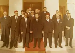 حكومة عبد الحميد البكوش أمام القصر الملكي دار السلام في طبرق بعد أداء كثير منهم اليمين الدستورية، وهم بدءاً من الثاني من اليسار: أحمد البشتي، سالم لطفي القاضي، عبد الحميد البكوش، أحمد عون سوف، أحمد الصالحين الهوني، مصطفى عبد الله بعيو، بشير السني المنتصر (في الخلف المرتدي للنظارات السوداء).