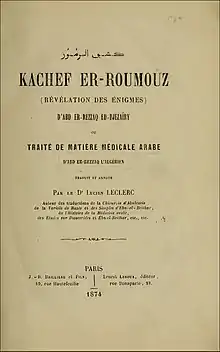 ![]() الصفحة الاولى من كتاب كشف الرموز لمؤلفه عبد الرزاق بن حمدوش الجزايري ترجمة فرنسية |