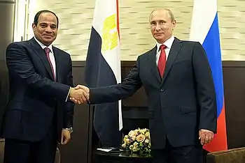 عبد الفتاح سعيد حسين خليل السيسي (19 نوفمبر 1954)، هو الرئيس السادس والحالي لجمهورية مصر العربية،[4] والقائد الأعلى للقوات المسلحة المصرية، انتُخب سنة 2014 لمدة 4 سنوات بعد نجاحه في الانتخابات الرئاسية 2014،[5] ذلك بعد إطاحته بالرئيس محمد مرسي في 3 يوليو 2013 (أول رئيس مدني منتخب بعد ثورة 25 يناير) بعد سنة من توليه مقاليد الحكم عقب مظاهرات طالبت برحيله، وأعلن عن إجراءات صاحبت ذلك عُرِفت بخارطة الطريق،[6][7] عارضها مؤيدو الرئيس محمد مرسي وقتها واعتبروها -ومعهم جزء من المُجتمع الدولي والعربي- انقلاباً عسكرياً[8][9][10] بينما أيدها المتظاهرون والمعارضون للرئيس محمد مرسي وقتها واعتبروها ثورة وتأييدا لمطالب شعبية.[11][12][13][14][15]