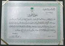 • درع من وزير المعارف محمد احمد الرشيد بتاريخ 21 رجب 1416 ، كتب فيها : "لمسة وفاء، وشعار حبّ، واعتراف بالريادة والفضل" ((....))