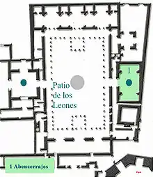 ماذا تبقى محفوظ بشكل معقول اليوم، اثنتين من الوحدات المعمارية الكبيرة، وضعت بزاوية قائمة مع بعضها البعض. لكل منها فناء وسطي مفتوح مع بئر ماء "في المنتصف—بركة طويلة في فناء ميرتل ونافورة في فناء الأسود. هناك عدد من الغرف والقاعات مفتوحة على فناء واسع بشكل مباشر أو عن طريق أقواس. توجد حمام واحد بين الوحدتين، وعدد من الغرف الصغيرة والأفنية بين المدينة الرسمية والقلعة. من الاحتمال، أنة كان هناك مساكن تحت محكمة الأسود في منطقة تم بناؤها من جديد بعد الفتح المسيحي.