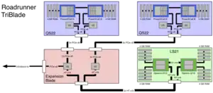 3- وحدة التوصيل Connection Unit: تتألف من 60 حاوي BladeCenter أي 180 TriBlade موصولة ببعضها بمبدل من نوع ISR2012 Infiniband Switch .. مواصفات وحدة التوصيل : 360 معالج Ooptern dual-core ب 2.88 TIB ذاكرة. RAM . 720 معالجPowerXcell 8i ب 2.88 TIB ذاكرة RAM . 12 نظام x3755 ببوابتين Ethernet بسرعة تدفق 10GBit لكل واحدة .