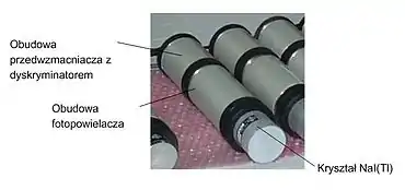 ويتصل بالرأس الحساسة مباشرة صمام تضخيم ضوئي، ويقوم بقياس الضوء المنبعث في البلورة. ويتصل صمام لجسيمات المتضهيم الضوء بمضخم إلكتروني وعداد إلكتروني لعد الأشعة المؤينة، ولتعيين مطال كل نبضة جهدية صادرة من صمام تضخيم الضوء.