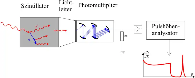 - يبين الرسم الأحمر توزيع عدد الإلكترونات المتولدة N في صمام التضخيم الضوئي (المحور الرأسي) بالنسبة إلى طاقة الشعاع الساقط E على البلورة الحساسة. والجزء من هذا الطيف الذي يخصنا هي القمة التي تتخذ شكل الجرس ووضعها على المحور الأفقي، فهي تعطي مباشرة مقدار طاقة الشعاع الساقط. أما جزء المنحنى الأمامي فيعتبر شوشرة إلكترونية يمكن فصلها عن القياس.