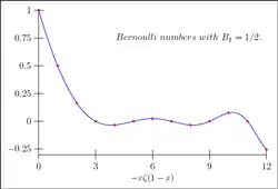 Bn = Bn(0). تعاقب مصاحب: 1, −1/2, 1/6, 0,....